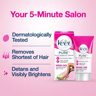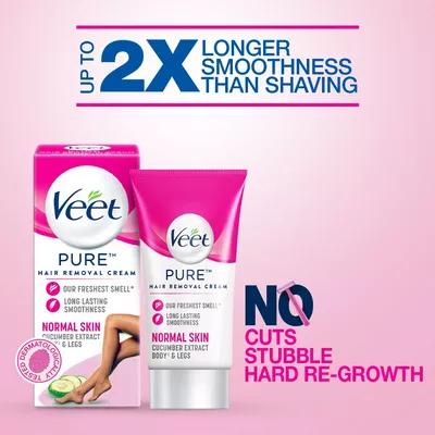 Get smooth skin and the freedom to wear any look, any time with Veet. Veet Pure Hair Removal Cream for Normal Skin, enriched with cucumber extracts, is the right solution when going to the salon is not an option. It effectively removes even short stubborn hair and leaves skin moisturized for up to 24 hours*. It can be used on legs, arms, bikini lines, and underarms for salon-like smoothness. Veet Pure Hair Removal Cream for Normal Skin gives you perfect hair removal results in just 3 to 6 minutes. Follow the steps mentioned on the pack using the spatula provided. Before using the product, please read the pack precautions carefully. With regular use; get fewer, finer, and softer hair growing back!